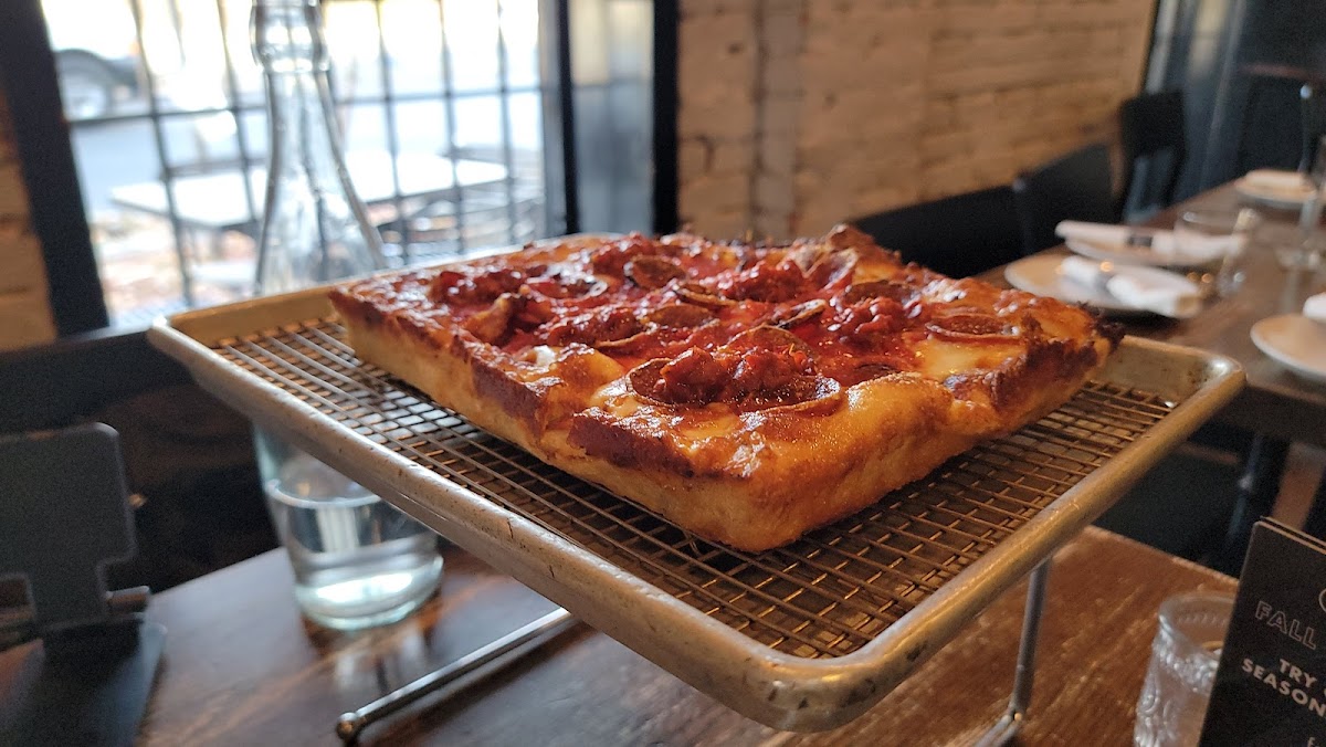 Great pizza! Detroit-style pizza served in a cool, hip restaurant. The flavors are terrific as is the dough - a very good pizza! The bar is great as they have draft wines and beer. The staff and service are all top-notch! Worth the wait when in town. Excellent at home pizza making classes are offered as well!